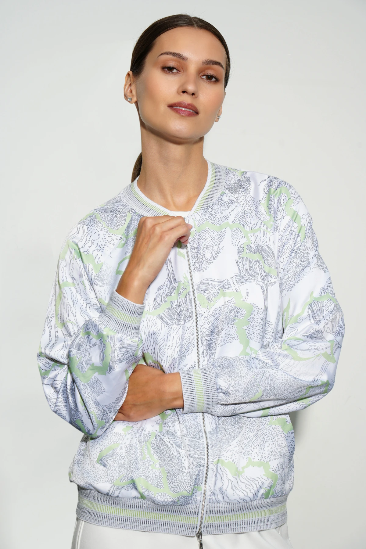Бомбер из поливискозы, изнаночная сторона которой – тактильно приятна и гигроскопична, а лицевая – имеет деликатный сатиновый блеск. Авторский принт «Магия весны», вдохновленный природными мотивами, создаёт легкое весеннее настроение и делает модель ярким акцентом образа.