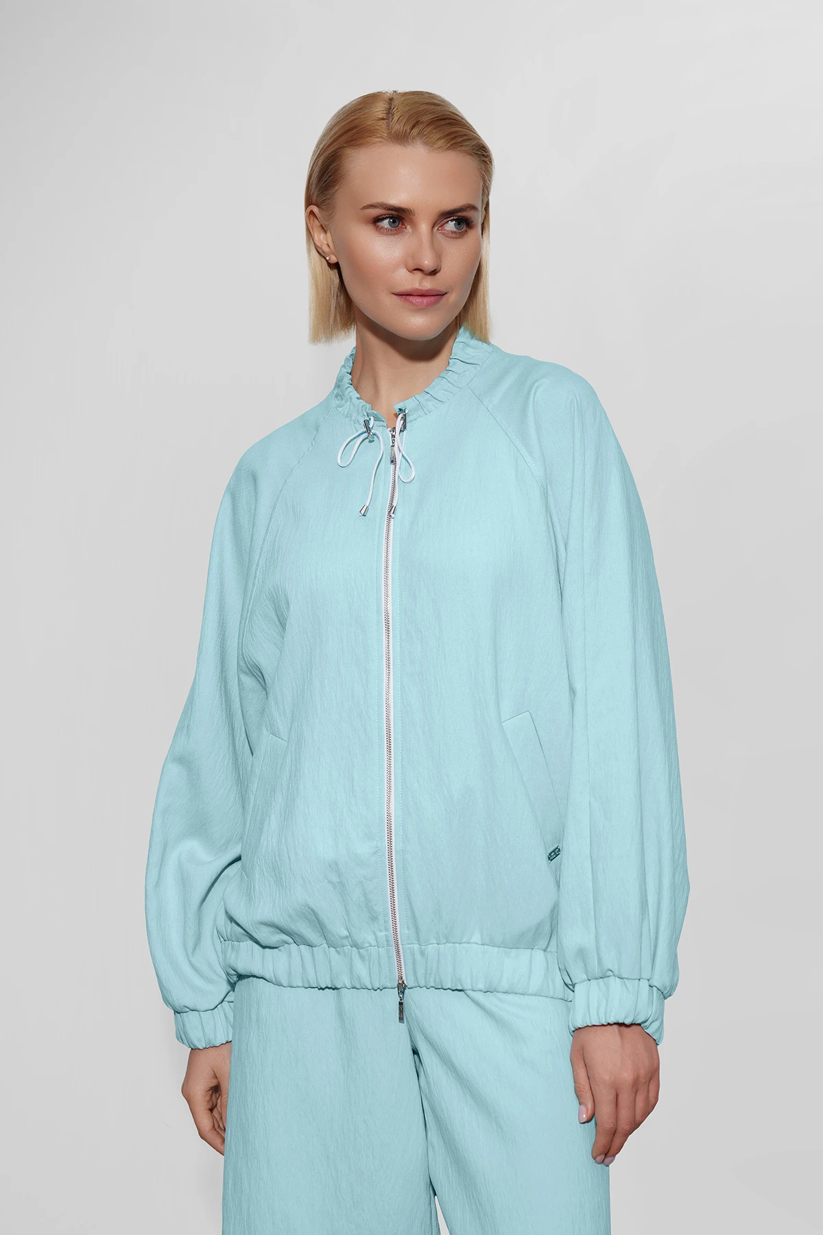 Бомбер из жатой ткани на основе премиального района в насыщенном бирюзовом оттенке. Свободный силуэт обеспечивает удобство и универсальность модели.