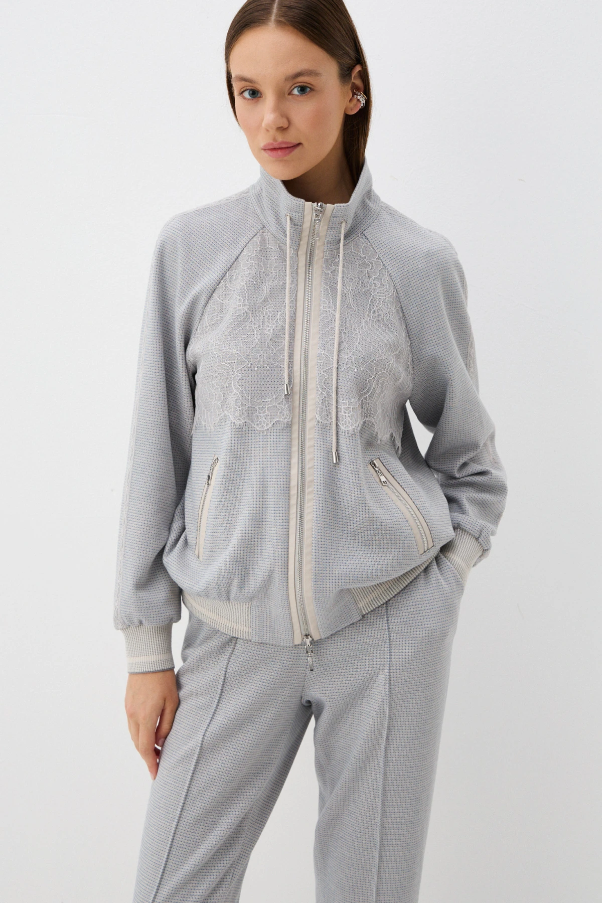 Бомбер из ткани смешанного состава с добавлением хлопка и премиальной разновидности вискозы – ра́йон. Бомбер в клетку в серо-бежевых оттенках – классическая по характеру и оригинальная по форме модель, которая подарит Вам комфорт и расслабленность в образах. Спорт-шик с романтичными деталями: вставка из воздушного кружева и кант из экозамши в молочном оттенке создают любимые брендом тонкие нюансные акценты. - Свободный крой - Длинные рукава-реглан на манжетах - Удобные карманы на молнии - Манжеты и низ бомбера оформлены авторской бейкой - Застёжка на молнию - Трикотажный шнур в воротнике - Подклад с авторским принтом Рост модели 174 см Размерная линейка 42-54