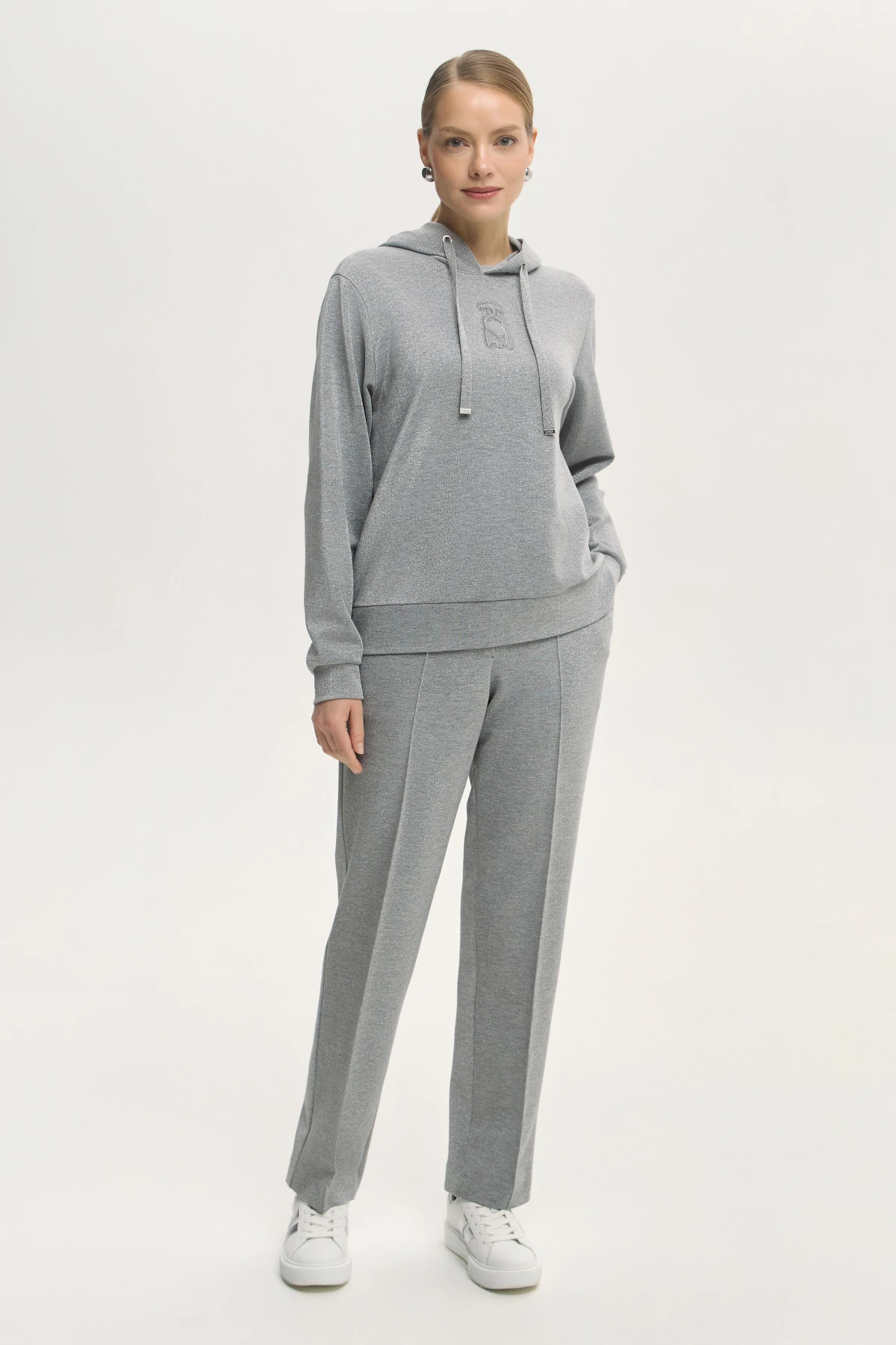 Фактура костюмной ткани с люрексом выглядит выразительно и при этом остаётся практичной. Серый оттенок легко сочетается как с базовыми, так и с насыщенными цветами. Модель дополнена удобными карманами.