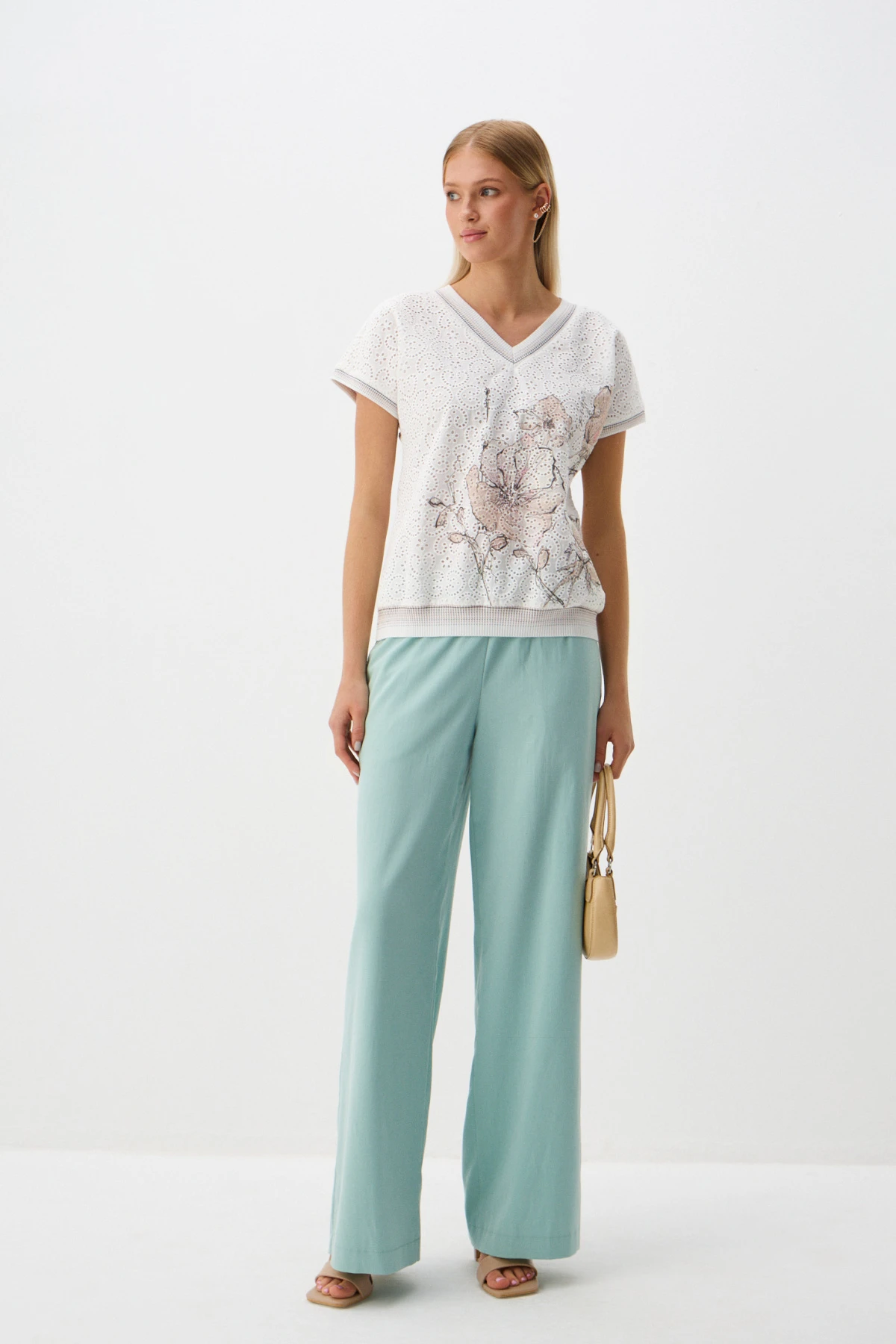 Прямой крой брюк создает стильный силуэт, обеспечивая комфорт и свободу движений. Эластичный пояс обеспечивает удобную посадку, а удобные карманы добавляют практичности. Ткань с добавлением прочного и практичного бамбука гигроскопична и воздухопроницаема. Свежий мятный оттенок привнесёт расслабленное летнее настроение в Ваш образ. - Широкие прямые брюки - Эластичный пояс - Удобные карманы Рост модели 175 см Размерная линейка 42-52