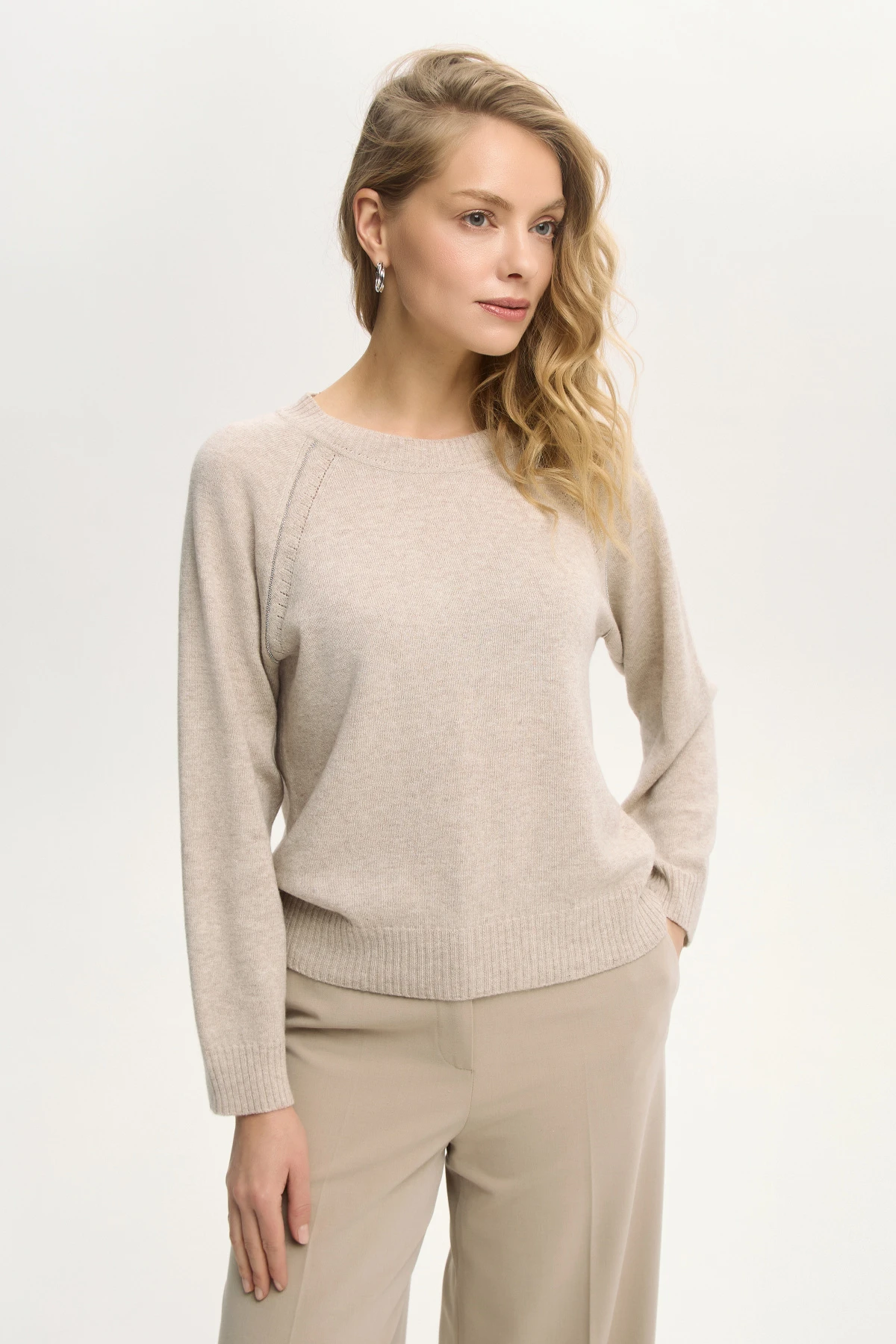 Натуральный песочный оттенок — базовый и актуальный в любом сезоне. Декор по линии рукава-реглан цепочкой мониль и вязаной аккуратной перфорацией добавляет изюминку базовой модели. Подходит как для многослойных образов, так и как самостоятельный элемент.