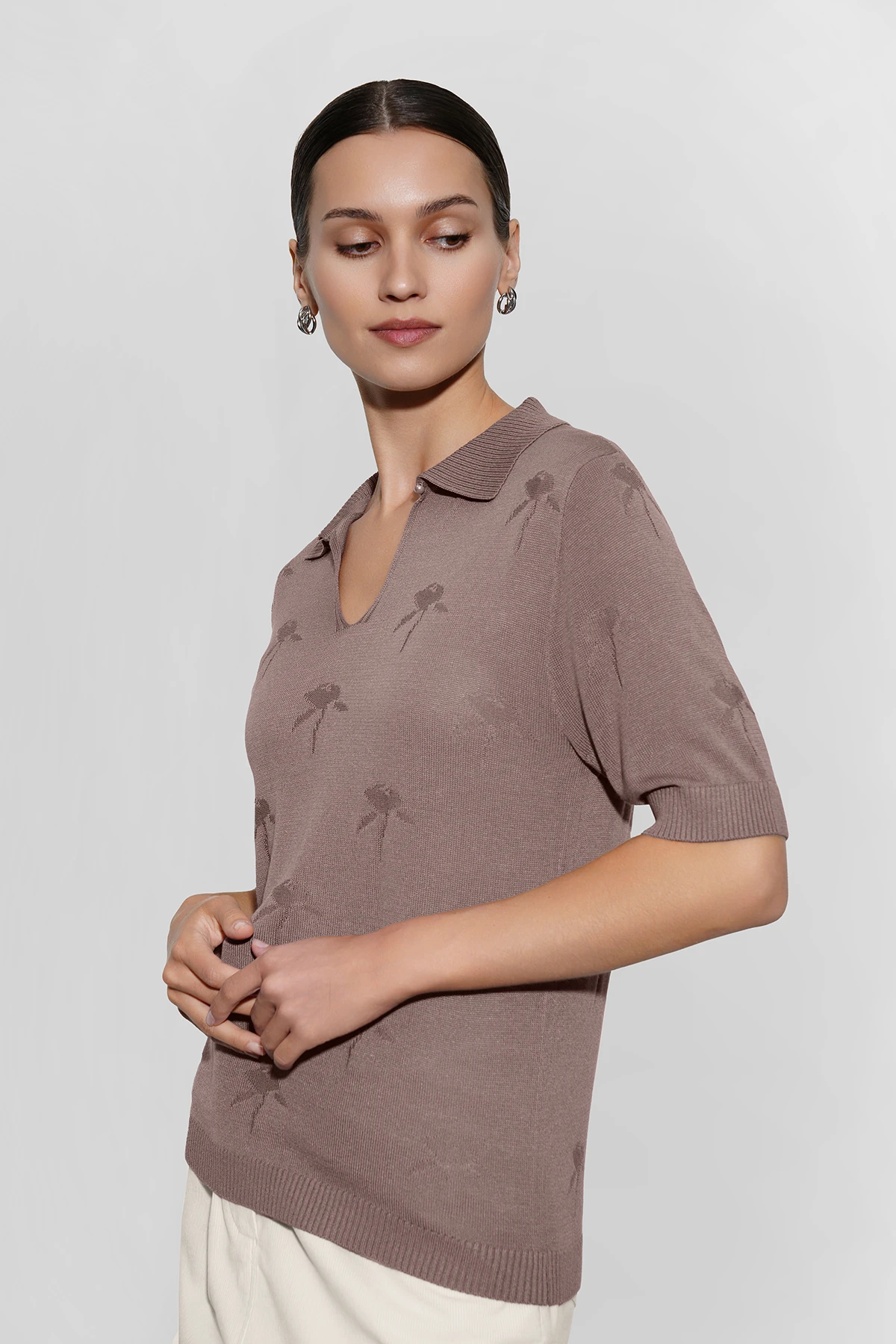 Воротник-поло с вырезом-каплей добавляет игривую нотку, а декоративный раппорт в виде изящных пионов придаёт модели утончённость. Удобный и элегантный джемпер легко дополнит как повседневный, так и романтичный наряд.