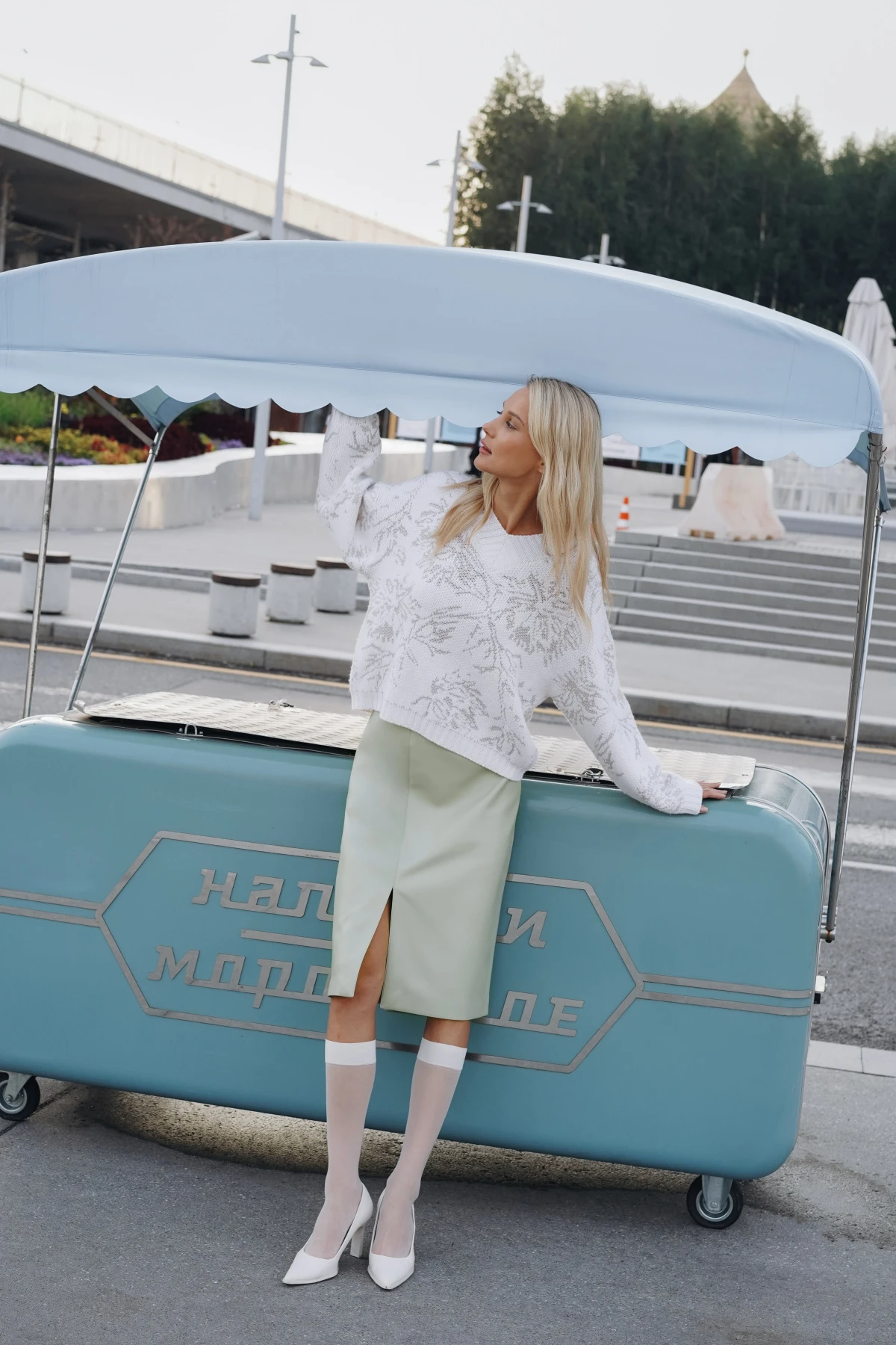 Силуэт с плавной линией плеч придаёт образу мягкость и объём без утяжеления. Светлая палитра и вязаный рисунок создают тонкое настроение. V-образный вырез делает акцент на шею и удобен для подбора украшений.