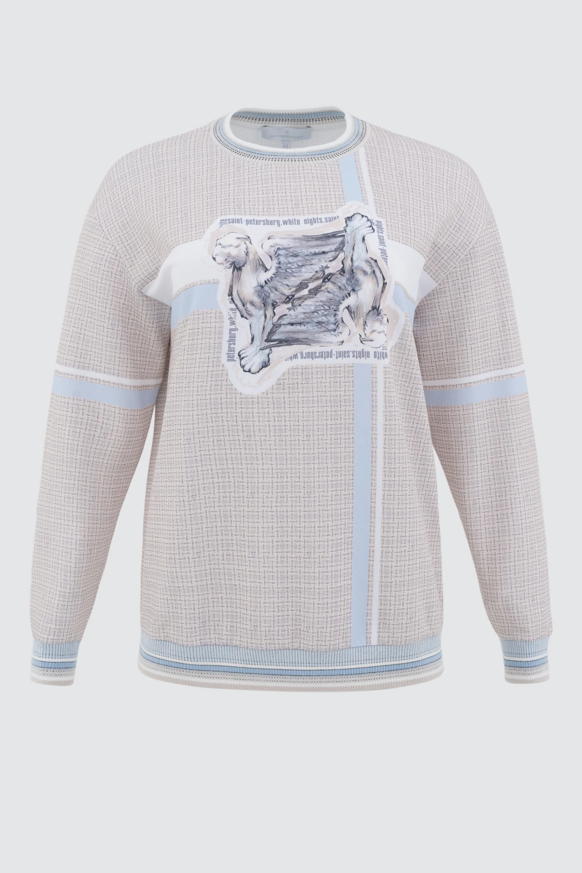 Свитшот из двухниточного футера с добавлением хлопка с многослойным авторским принтом. На фоне оттенка "теплый песок" мелкий раппорт дополнен горизонтальными и вертикальными полосками в оттенках "белый шёпот" и "голубая даль".