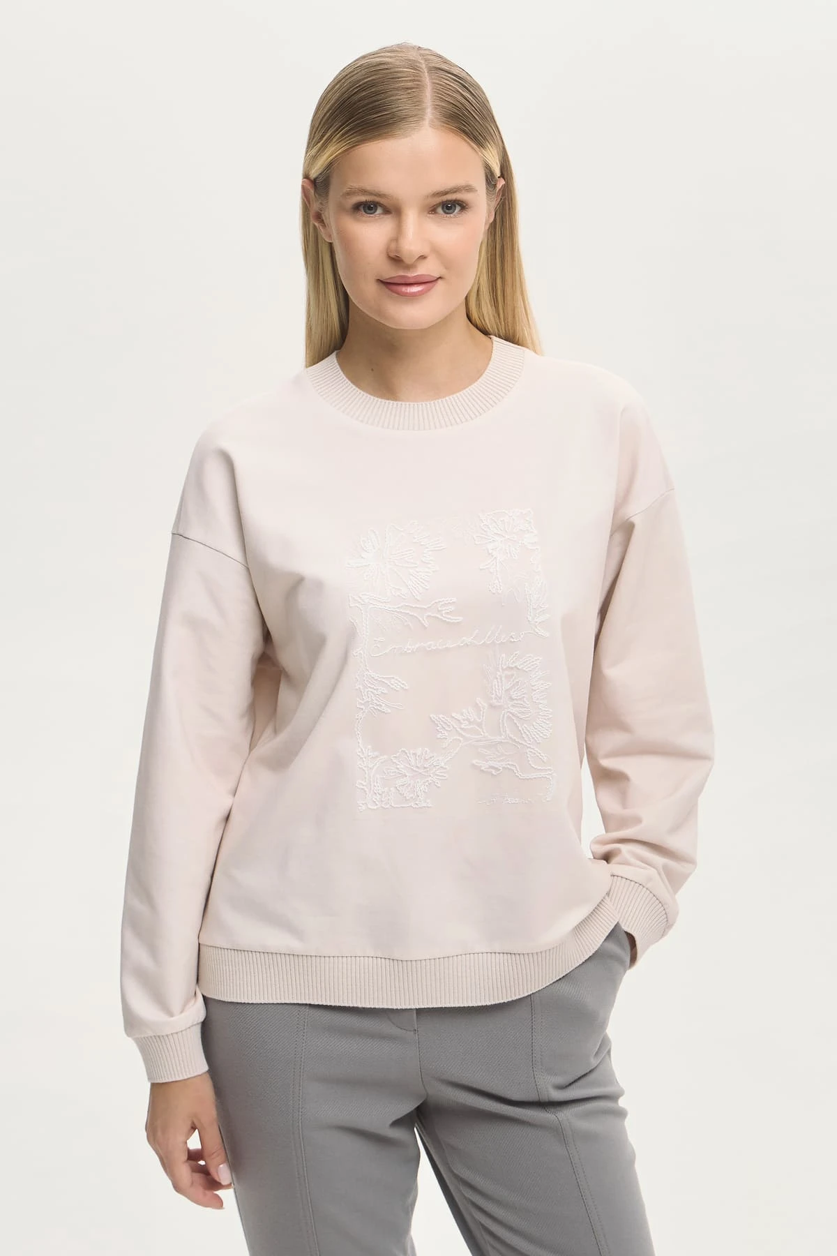 Нежный оттенок и мягкая фактура ткани делают модель универсальной для гардероба. Авторская вышивка добавляет деликатный акцент и подчёркивает индивидуальность.