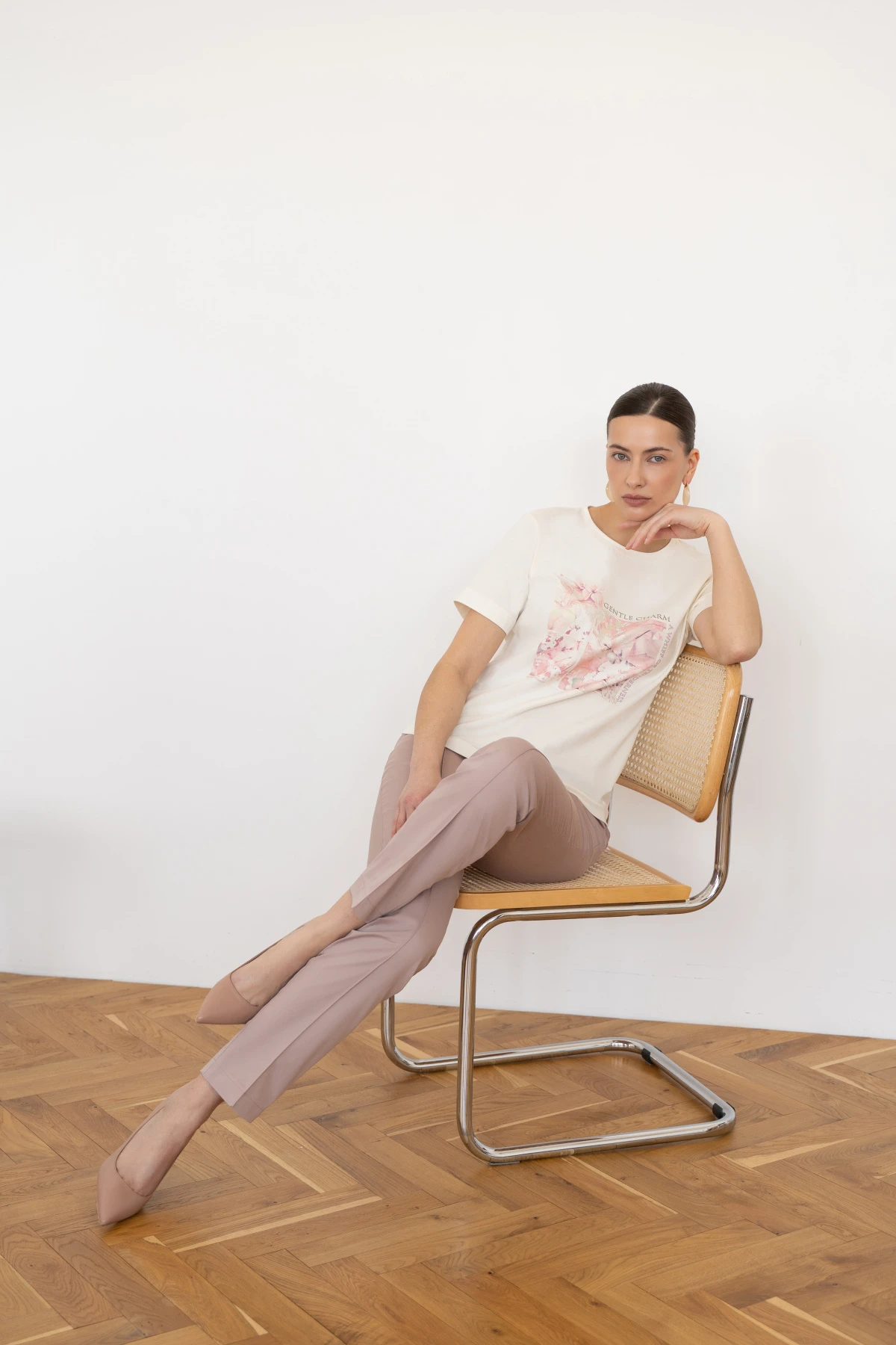 Футболка из высококачественного хлопкового трикотажа Пенье в нежном сливочном оттенке. Главный акцент модели - авторский флоральный принт в изысканных персиковых тонах, который дополняют надписи «gentle charm» (с англ. «нежный шарм») и «a whiff of tenderness» («дыхание нежности»).
