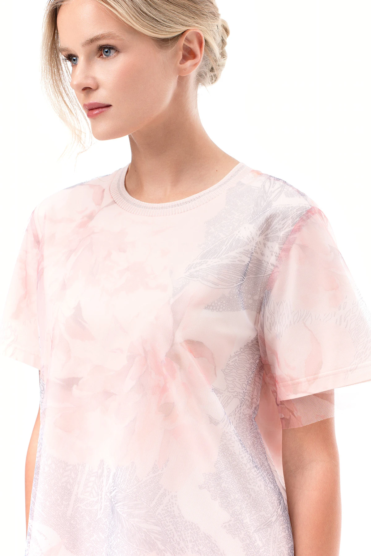 Футболка из двух типов тканей: верхний слой – из воздушной сетки с нежным флоральным принтом, нижний слой – из эластичного хлопкового трикотажа Пенье в персиковом оттенке. Многослойность создаёт игру объёмов и длин.