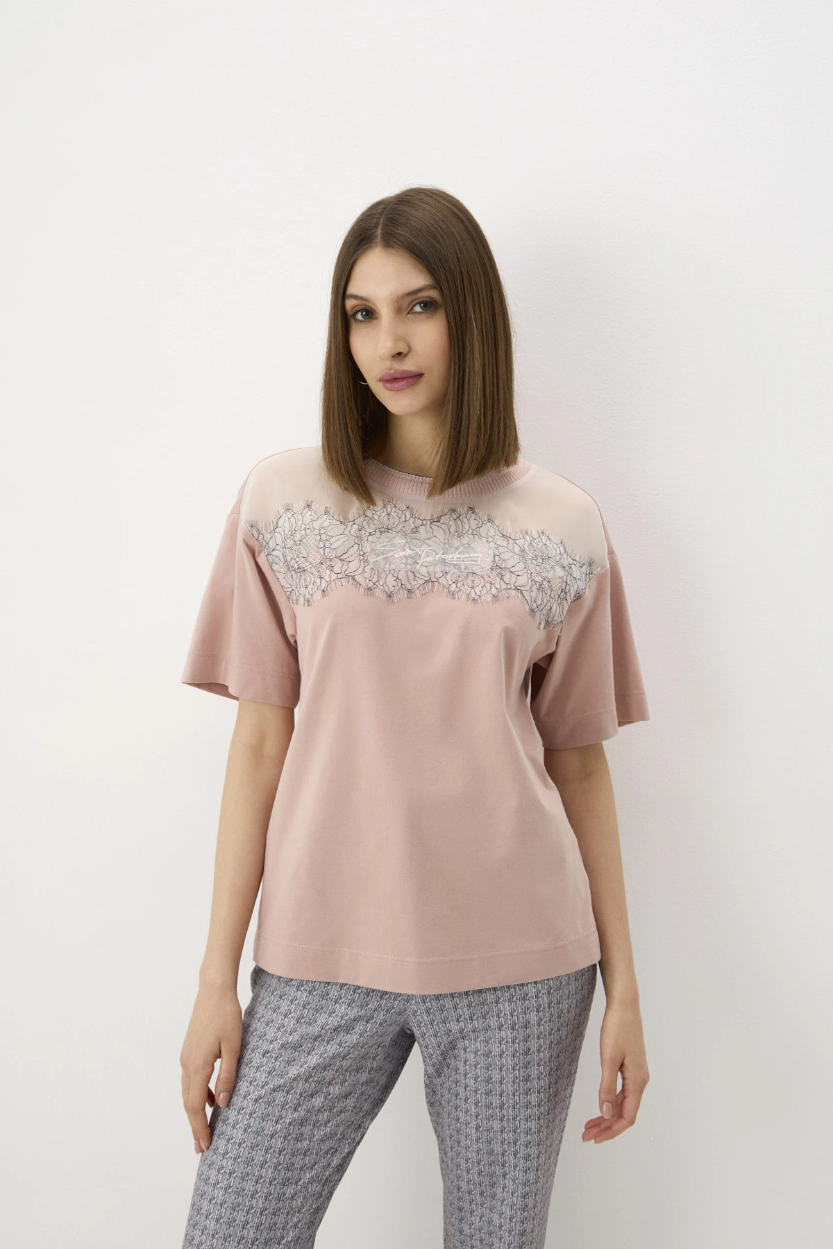 Классная футболка,я бы даже назвала ее джемпером)))отличный крой,трапеция.Подчеркивает фигуру)широкий рукав.Ткань тактильно приятная,кружево смотрится деликатно.Цвет приятный пастельный.Полный восторг!Спасибо за скидку)