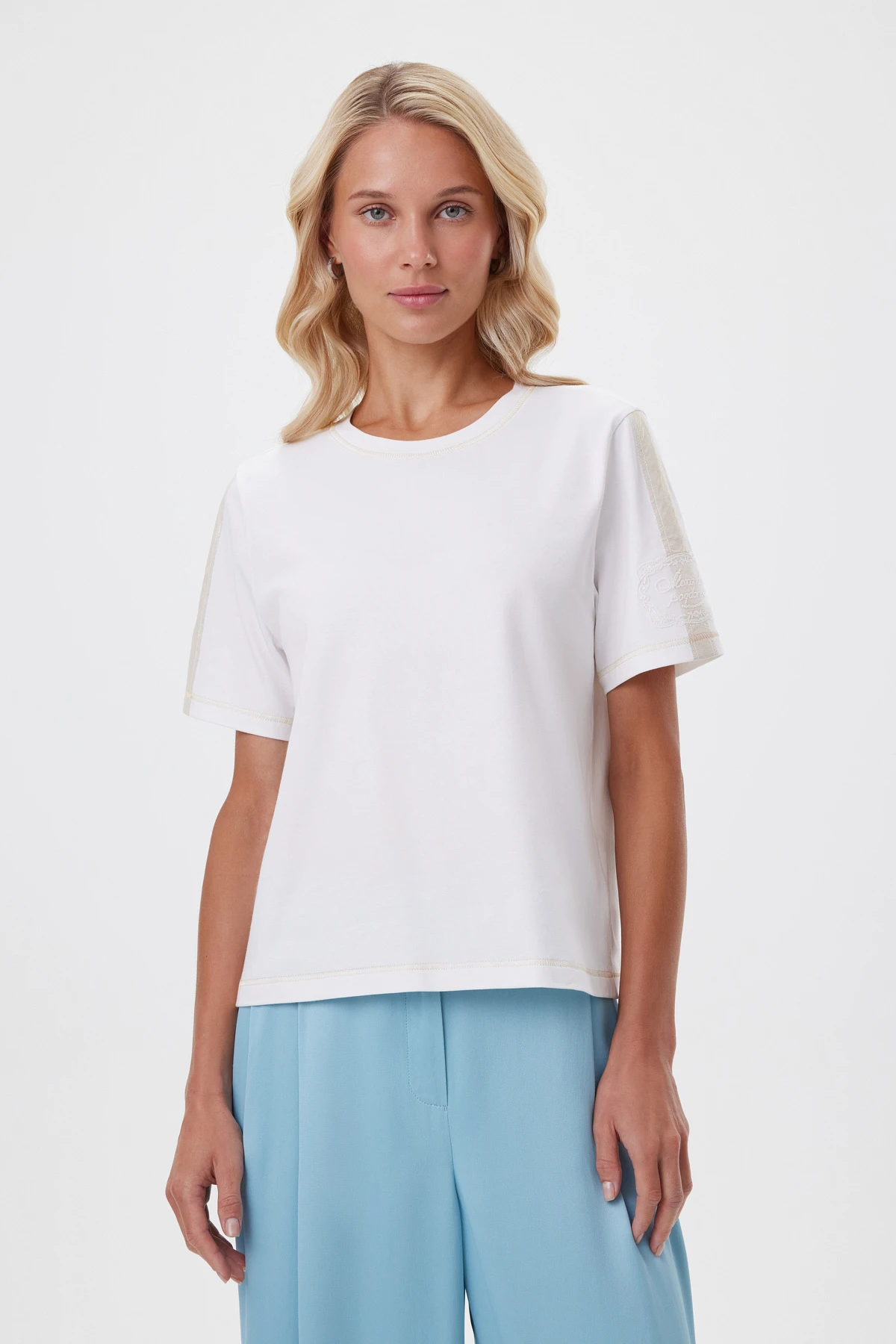 Отделочная строчка по горловине, рукавам и низу выполнена с настилом из метанита: нить не просто фиксирует край, а даёт мягкое свечение, похожее на тонкую позолоту. На рукаве — деликатный лампас с лентой и вышивкой. Благодаря тонким деталям это не просто базовая футболка, а изделие с технологичными элементами по люксовым стандартам, как баланс между минимализмом и ювелирной точностью.