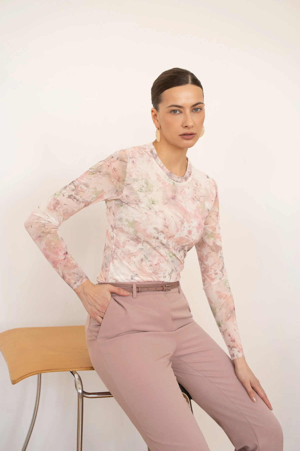 Лонгслив из мягкой эластичной сетки с авторским акварельным принтом сочетает утонченность и комфорт. Полупрозрачная фактура ткани придаёт модели легкость и воздушность, а принт в пастельных оттенках создаёт романтичное настроение.