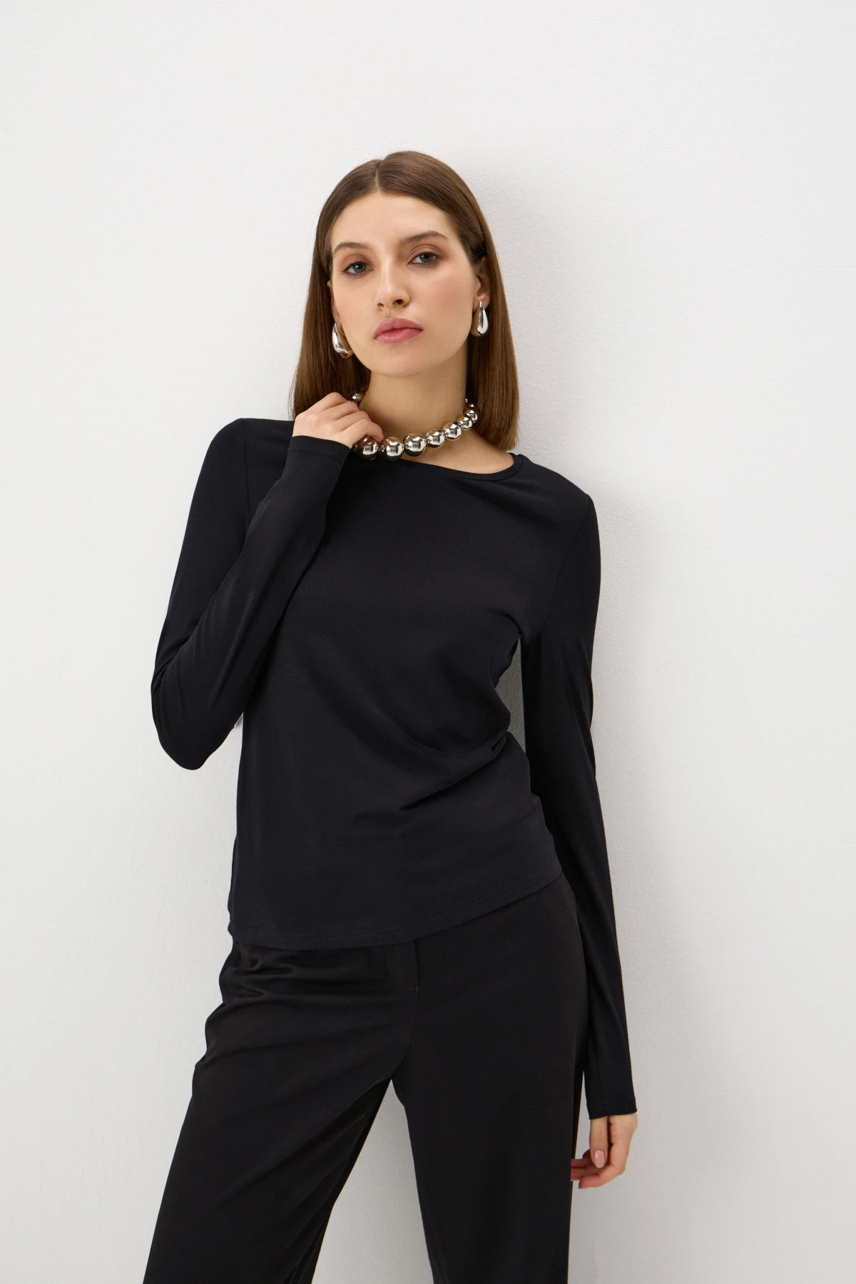 Монохромный лонгслив прилегающего силуэта из тактильно приятной, эластичной ткани.