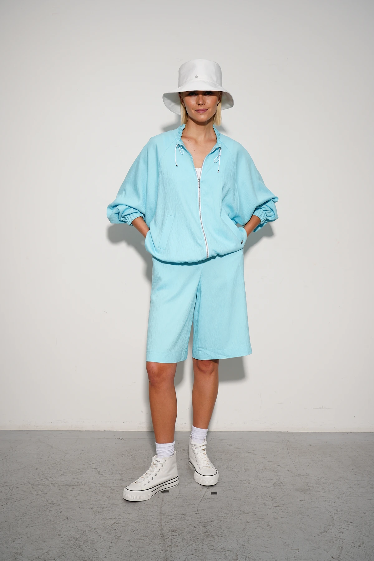 Шорты из жатой ткани на основе премиального района в освежающем бирюзовом оттенке. Широкий прямой крой и длина до колена обеспечивают свободу движений, а комфортные карманы добавляют практичности.