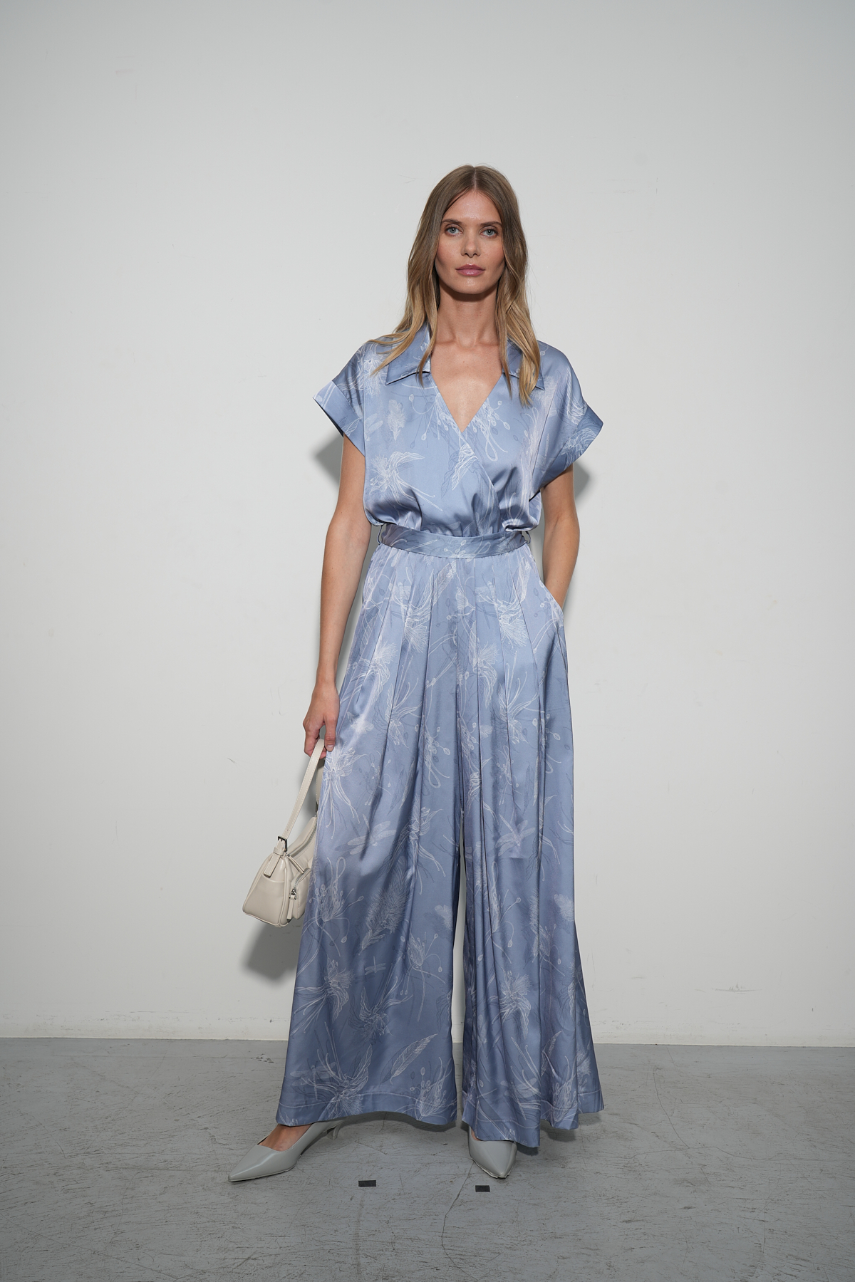 Эффектный комбинезон с авторским принтом «Летний этюд» в оттенке «серенити» подчёркивает утончённую женственность.