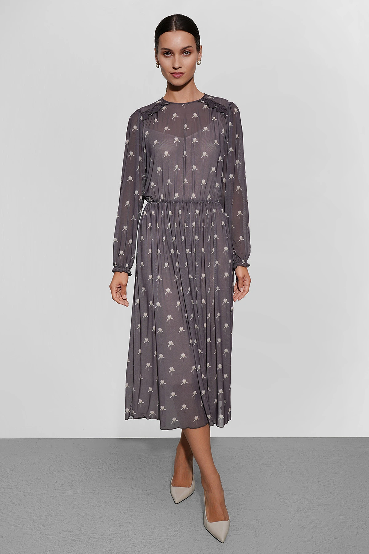 Платье из эластичной сетки с авторским раппортом в виде бутонов пионов на фоне изысканного оттенка «тауп». Платье отрезное по линии талии на эластичной ленте подчёркивает фигуру, создавая изящный силуэт. Юбка А-силуэта длины миди подойдет для любого типа фигуры.