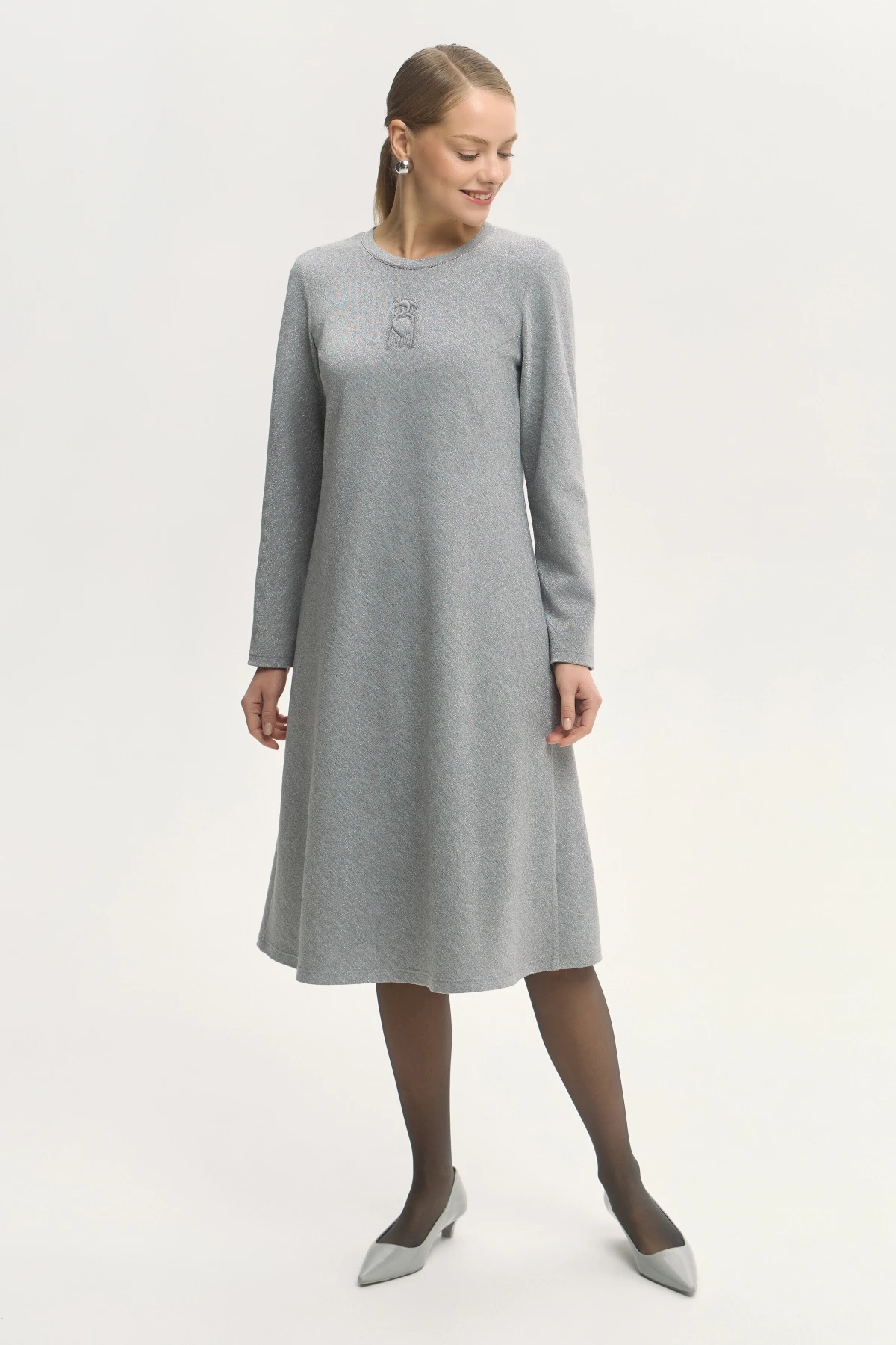 Платье из плотного трикотажа с добавлением вискозы и люрекса комфортно в носке и хорошо держит форму. Свободный А-силуэт не сковывает движений и универсален для разных фигур.