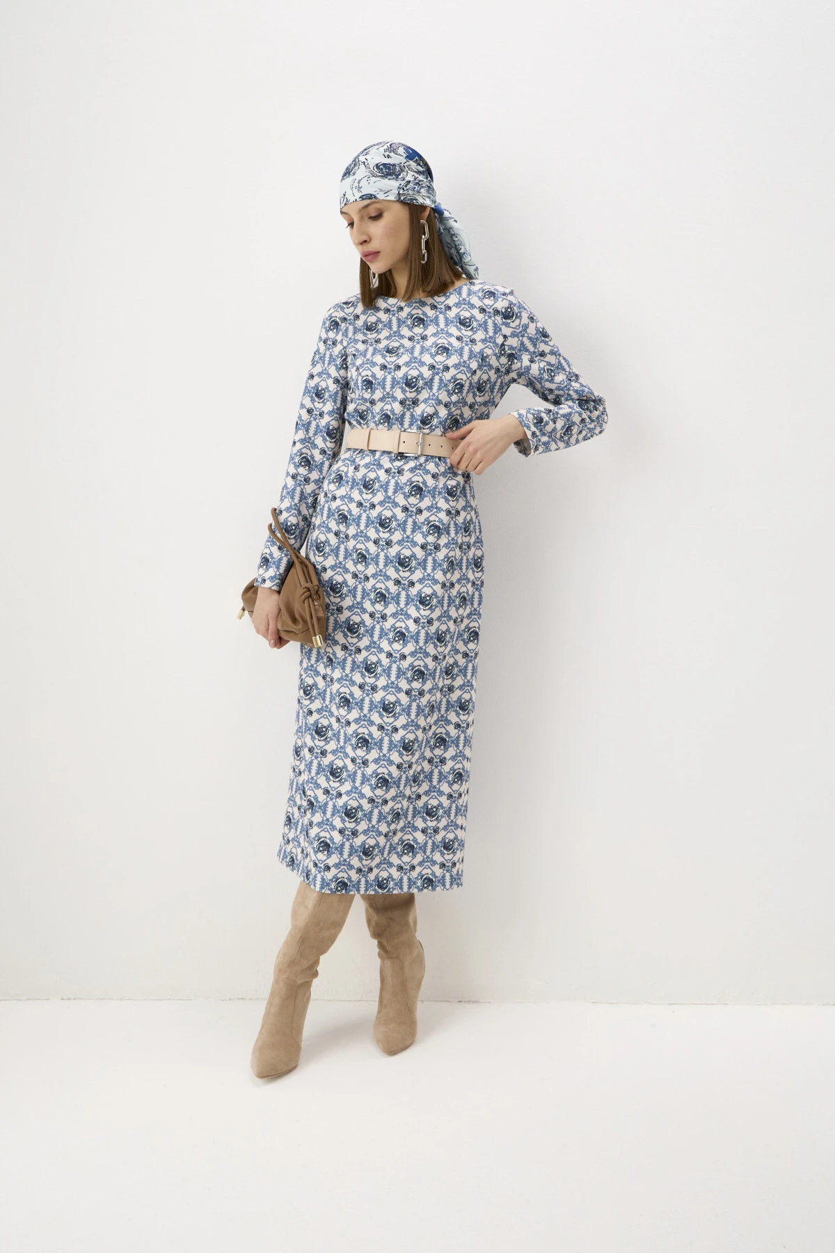 Платье-футляр прилегающего силуэта длины миди из плотной, эластичной ткани с авторским принтом. На фоне оттенка светлой пудры в линеарной технике изображены изысканные синие розы.