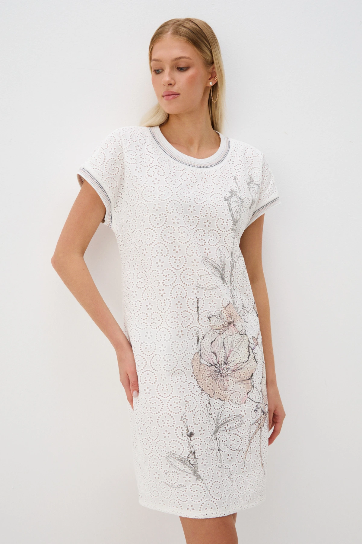 В платье «Воскресный полдень» ажур ткани переплетается с воздушным принтом и изящными линиями флорального рисунка. Шитьё – роскошная, романтическая и очень удобная ткань для летних образов. Платье имеет прямой силуэт, что создает лаконичный вид, подходящий для различных случаев. Комфорт в носке обеспечивает хлопковый подклад. Авторский принт В принте изображён тонкий момент – мы видим, как раскрываются нежные рассветные анемоны. Акварельный розовый блик небесного зарева касается их лепестков. Прекрасные весенние анемоны, или, как их называют петербуржцы, ве́треницы, растут в дубравах и считаются символом предвкушения перемен: это связано с тем, что бутоны закрываются на ночь и распускаются с восходом солнца. Хрупкость анемонов напоминает: нужно почувствовать каждый момент волшебной белой ночи! - Прямой силуэт - Длина выше колена - Короткие цельновыкроенные рукава на манжетах - Круглый вырез горловины и манжеты оформлены авторской бейкой Рост модели 175 см Размерная линейка 42-54