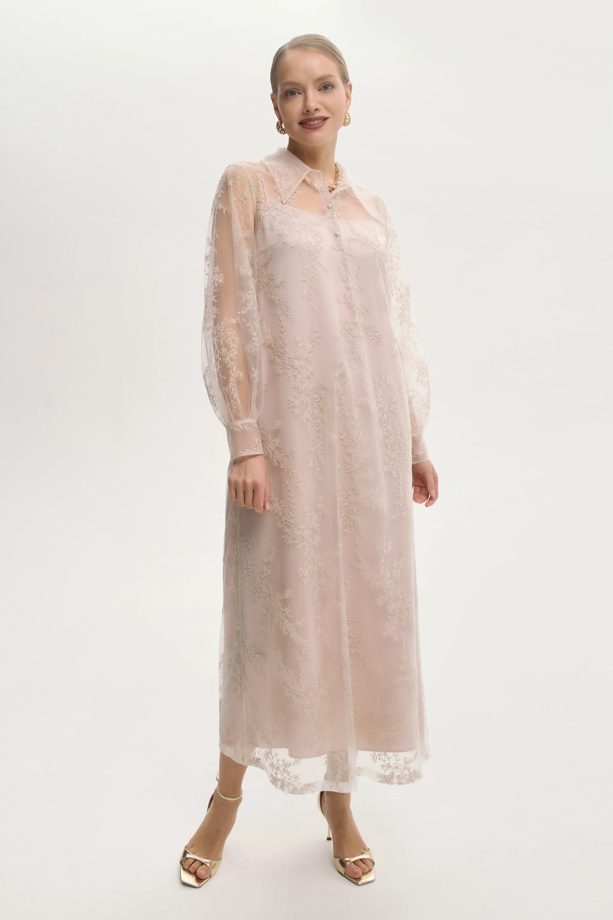 Платье свободного силуэта длины макси – богемное решение для вечернего выхода. Эффектное кружево с изящной вышивкой создаёт утончённый образ. Тончайшая отделка каждого шва придаёт дизайнерский характер модели.