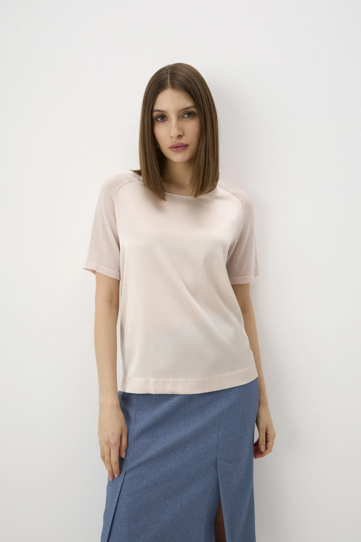 Блузка прямого силуэта с короткими рукавами реглан-погон на манжетах. Любимый приём бренда ALEXANDER BOGDANOV – сочетание разных фактур: перед блузки – из атласного шёлка; спинка и рукава – из тактильно приятного трикотажа, сочетающего разные типы вязки. Оба материала филигранно подобраны друг к другу в нежном персиковом оттенке.