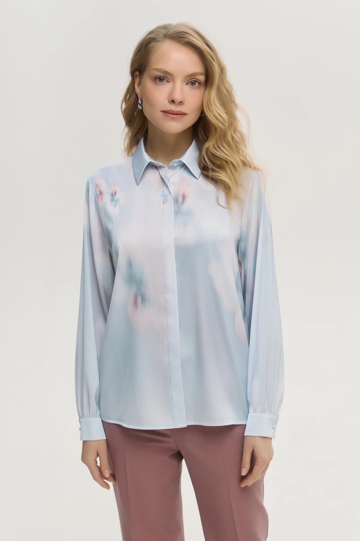 Прямая блузка с классическим рубашечным воротником — изысканная модель с романтичным настроением. Авторский принт в пастельной гамме подчёркивает свежесть кожи и придаёт образу утончённость.