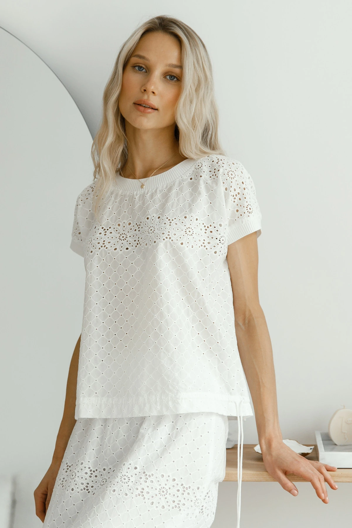 Блузон из хлопкового шитья в молочном оттенке с флорально-геометричной перфорацией — легкая и элегантная модель, идеально подходящая для жарких дней.