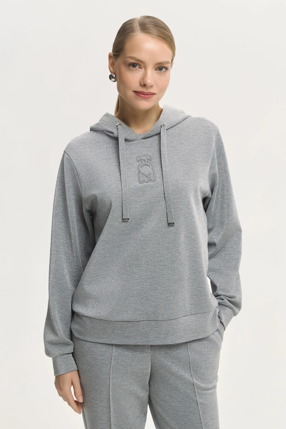 Свободное худи с капюшоном выполнено из мягкой ткани с вискозой и люрексом — тёплой, комфортной и визуально выразительной. Универсальный крой прекрасно сочетается с брюками, юбками и верхней одеждой.