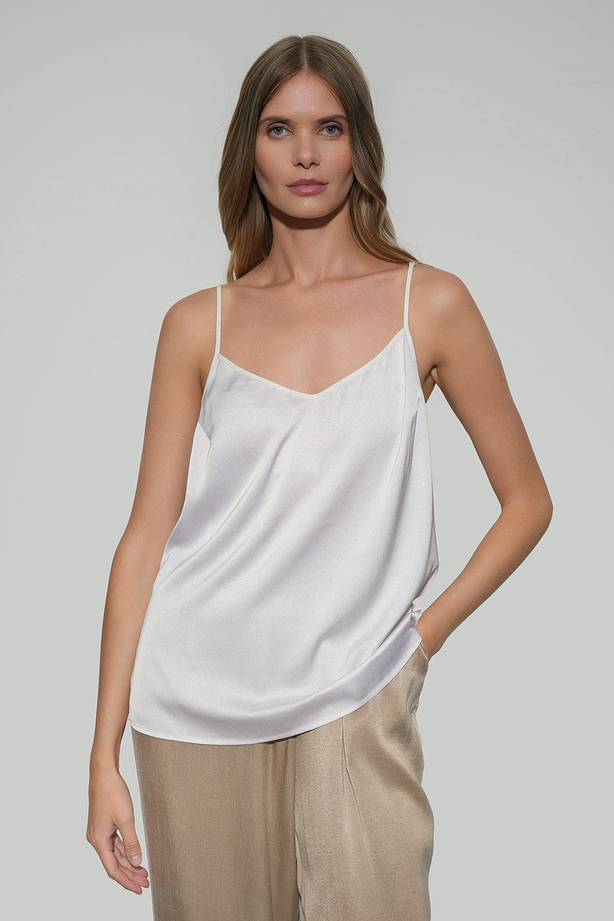 Топ из атласной ткани в песочном оттенке с деликатным узором fishbone выглядит утончённо и стильно. Свободный силуэт на тонких регулируемых бретелях обеспечивает комфорт, а нагрудные вытачки подчёркивают аккуратную посадку.