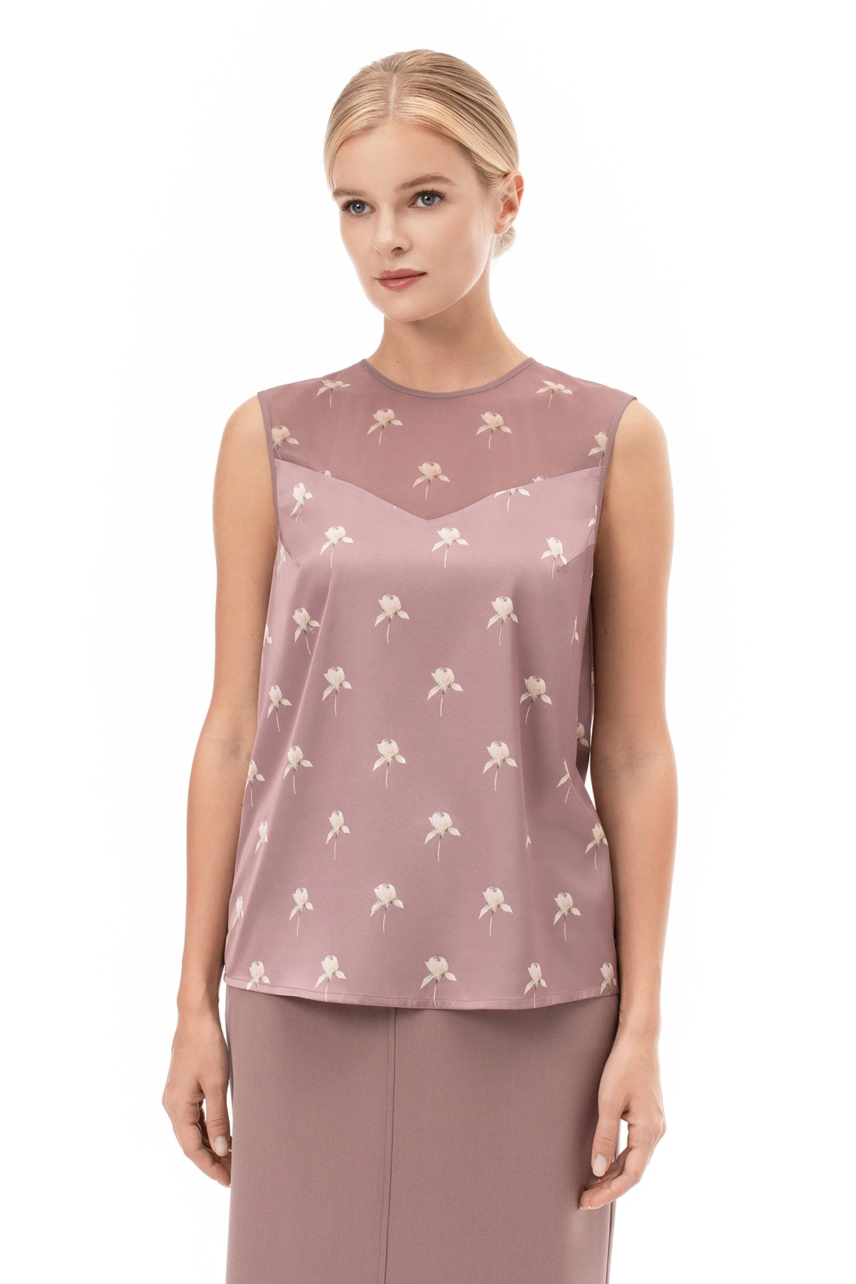 Топ из нежного атласа в оттенке «пралине» с авторским принтом в виде бутонов пиона —утончённая и романтичная модель. V-образная кокетка из эластичной сетки изящно подчёркивает линию декольте, а свободный крой обеспечивает комфорт и расслабленность.