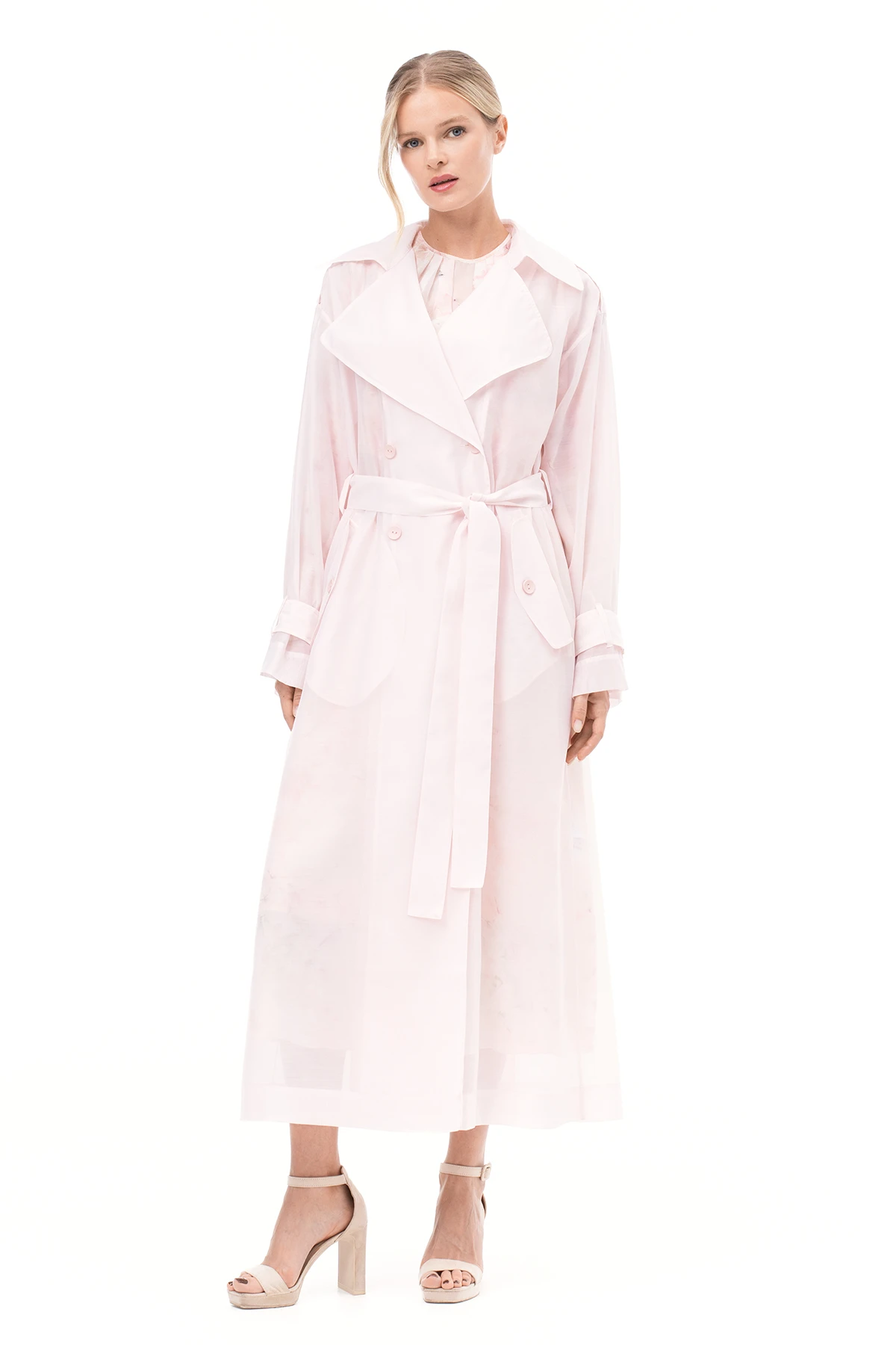 Двубортный тренч с английским воротником из полупрозрачной органзы в нежном пудровом оттенке.