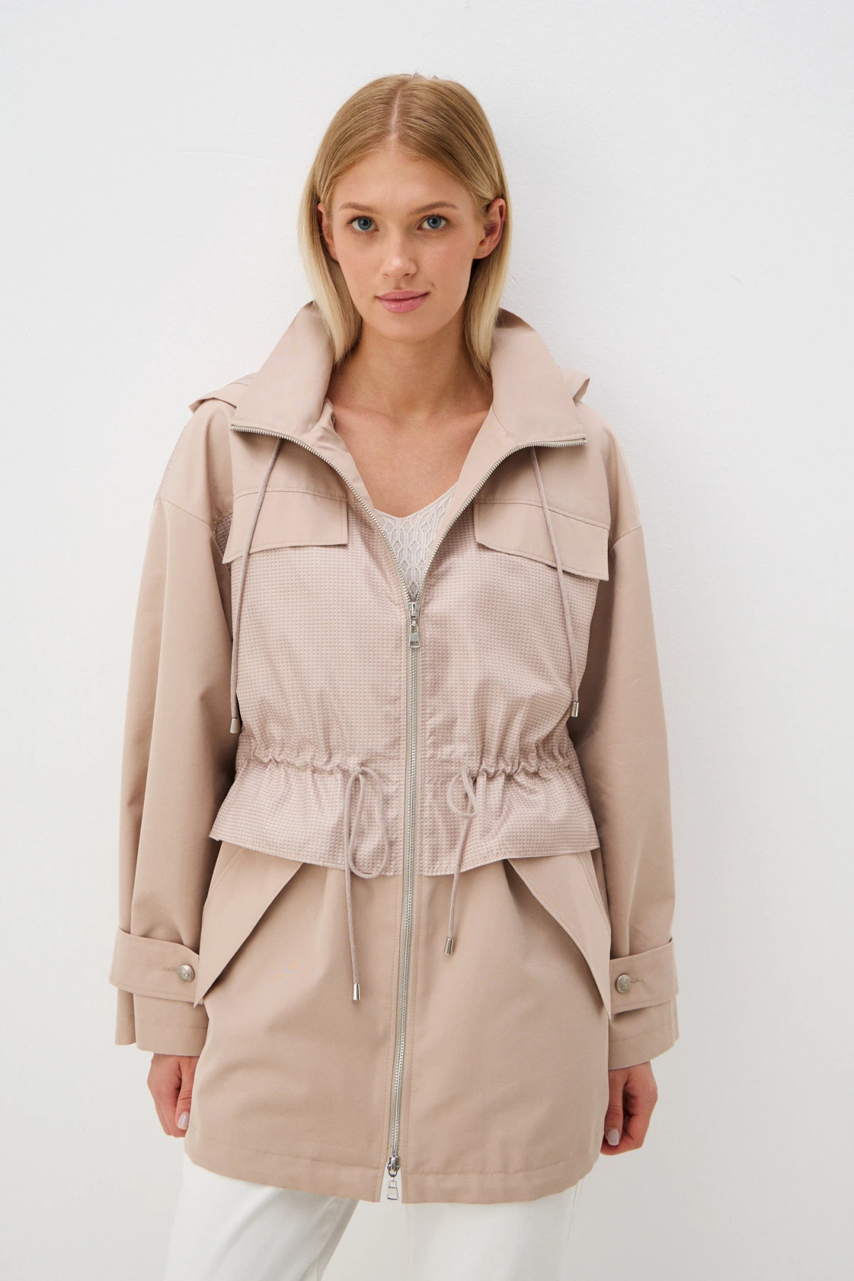 Ветровка выполнена из комбинации материалов, обеспечивающих тепло и комфорт в непогоду: практичное лаке с мелкораппортным принтом и монохромная смесовая ткань на основе хлопка с водоотталкивающей пропиткой в песочном оттенке.