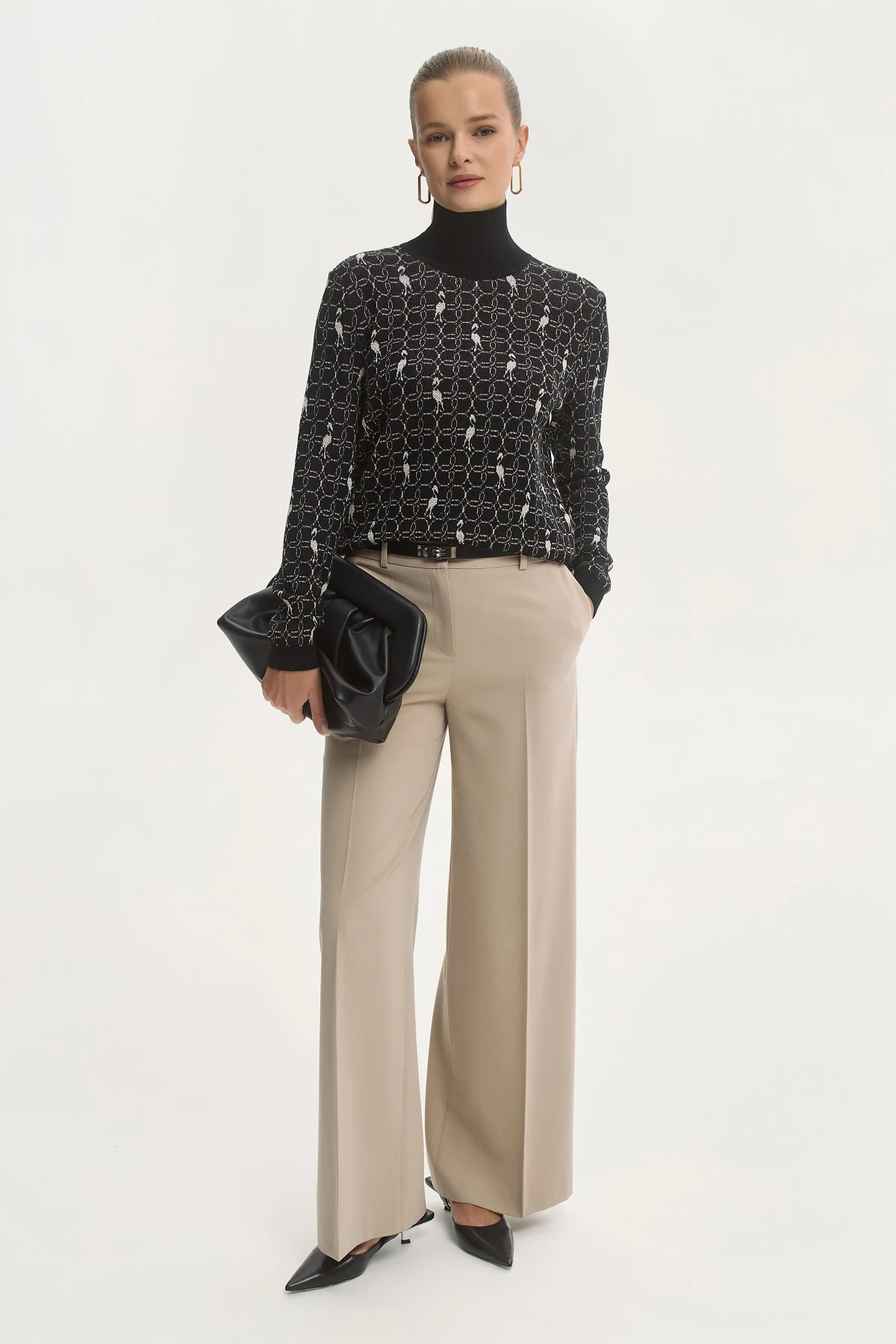 Контрастный графичный паттерн с белым вывязанным рисунком фламинго и стилизованным числом 88 на чёрном фоне делает образ современным и запоминающимся. Высокая мягкая горловина создаёт ощущение уюта и защищённости без утяжеления силуэта.