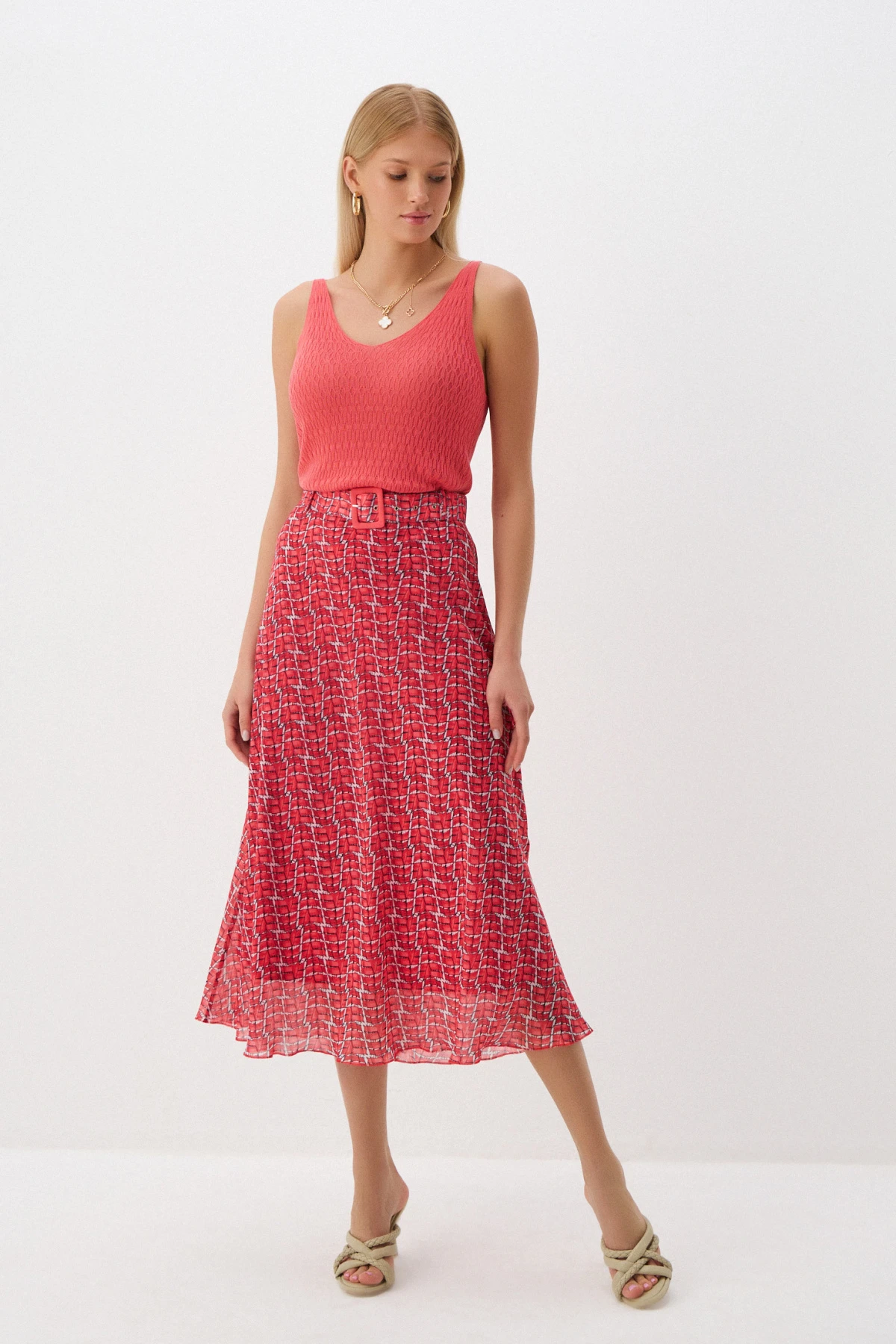 Юбка из воздушного шифона в алом оттенке с авторским принтом – яркий акцент Вашего образа. Ткань драпируется плавными шёлковыми волнами – юбка «оживает» на фигуре, подчёркивая все её достоинства. Юбка дополнена подкладом, обеспечивающим комфорт в носке. Авторский принт Принт визуально считывается не только как абстрактная геометрия, но и как наполненные романтическим символизмом парусники. - Алый оттенок - А-силуэт - Длина миди - Шлёвки - Съёмный пояс - Подклад Рост модели 175 см Размерная линейка 42-52