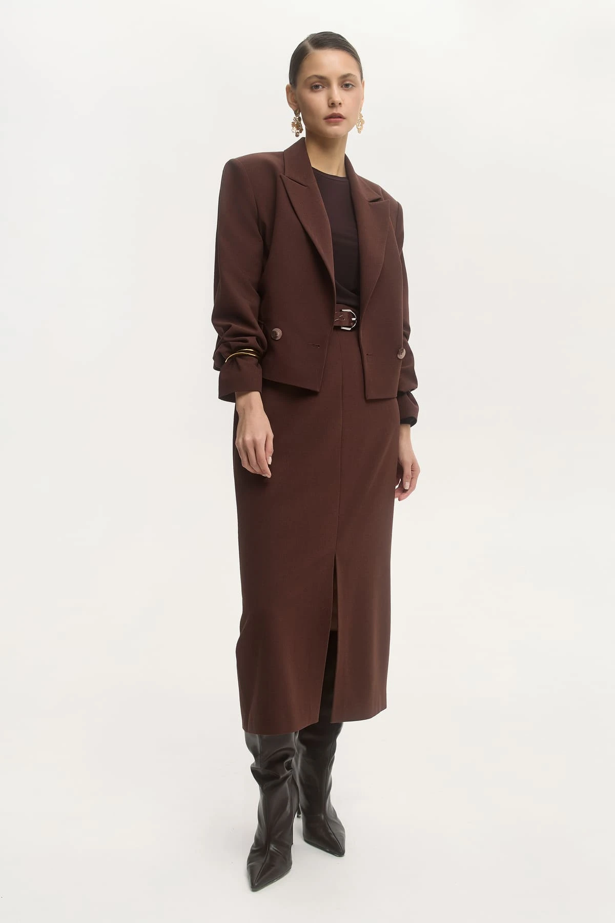 Гладкая костюмная ткань держит форму и подчёркивает строгость линии. Длина миди универсальна и подходит разной обуви. Глубокий шоколадный оттенок сочетается с базовыми и акцентными цветами.
