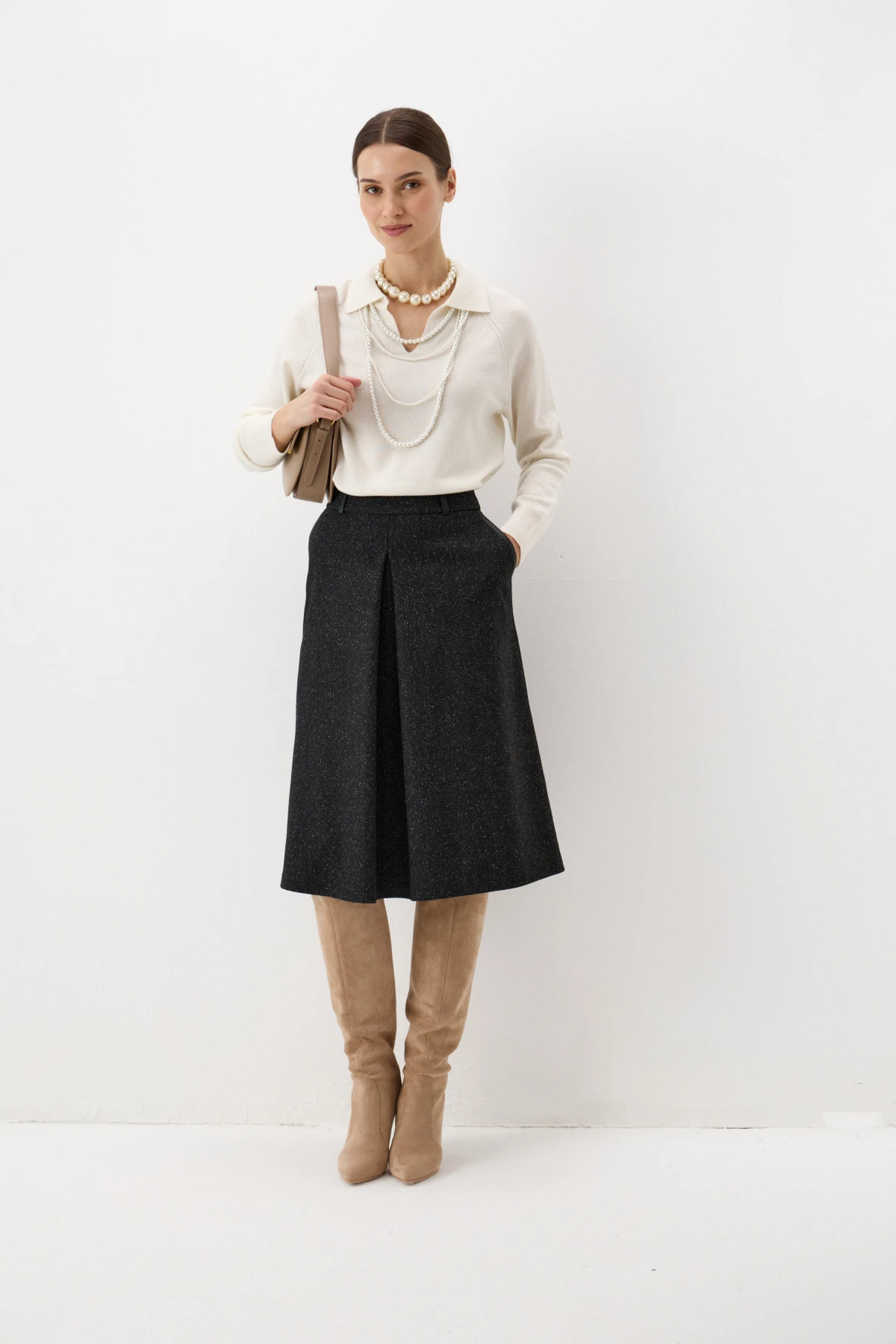 Классическая юбка А-силуэта из костюмной меланжевой ткани с добавлением натуральных шерсти и шёлка. Основной цвет ткани — «затмение», но в него вкраплены нити светлых пастельных оттенков, за счёт этого создаётся имитация «каменной» фактуры.