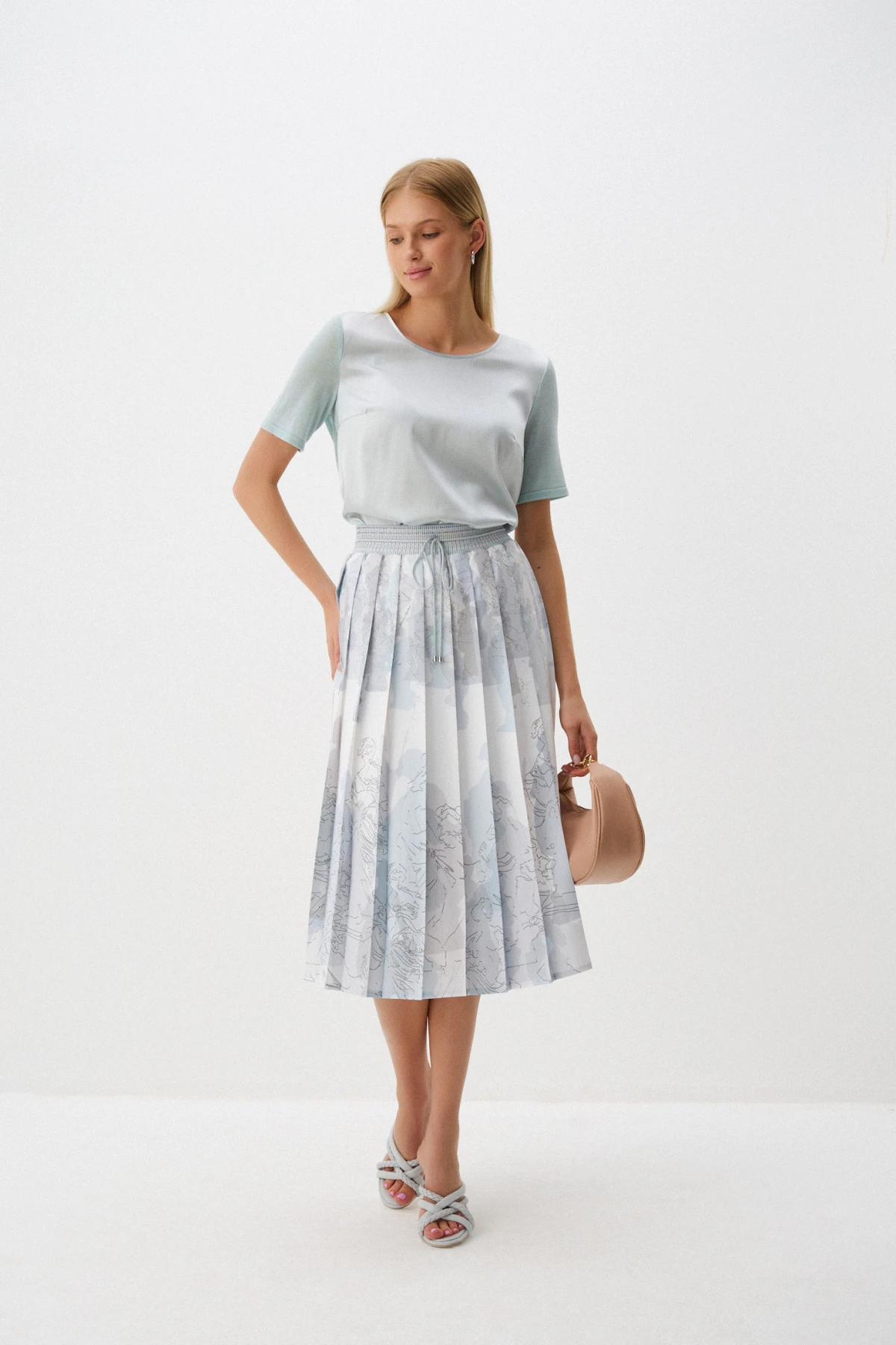 Очаровательная юбка плиссе с трикотажным поясом – это сочетание женственности, стиля и комфорта. Модель подчеркнёт Вашу утонченность и придаст образу неповторимый шарм. Юбка выполнена из твила – ткани с диагональным переплетением, тактильно приятной и простой в уходе. Авторский принт Главные акценты принта «Музы Петербурга» – ритмично расположенные очертания скульптур Летнего сада, которые, словно ожившие цветные тени, беседуют между собой о вечном. В основе принта – жемчужные и серо-голубые оттенки. Обратите внимание, как на переднем плане линеарно продублированы силуэты, что придаёт особую свето-тональную целостность композиции принта. Принт «Музы Петербурга» – это особое состояние души, которое дарит прогулка по Летнему саду! - А-силуэт - Длина миди - Пояс из авторской трикотажной бейки - Трикотажный шнур, регулирующий посадку - Подклад Рост модели 175 см Размерная линейка 42-54