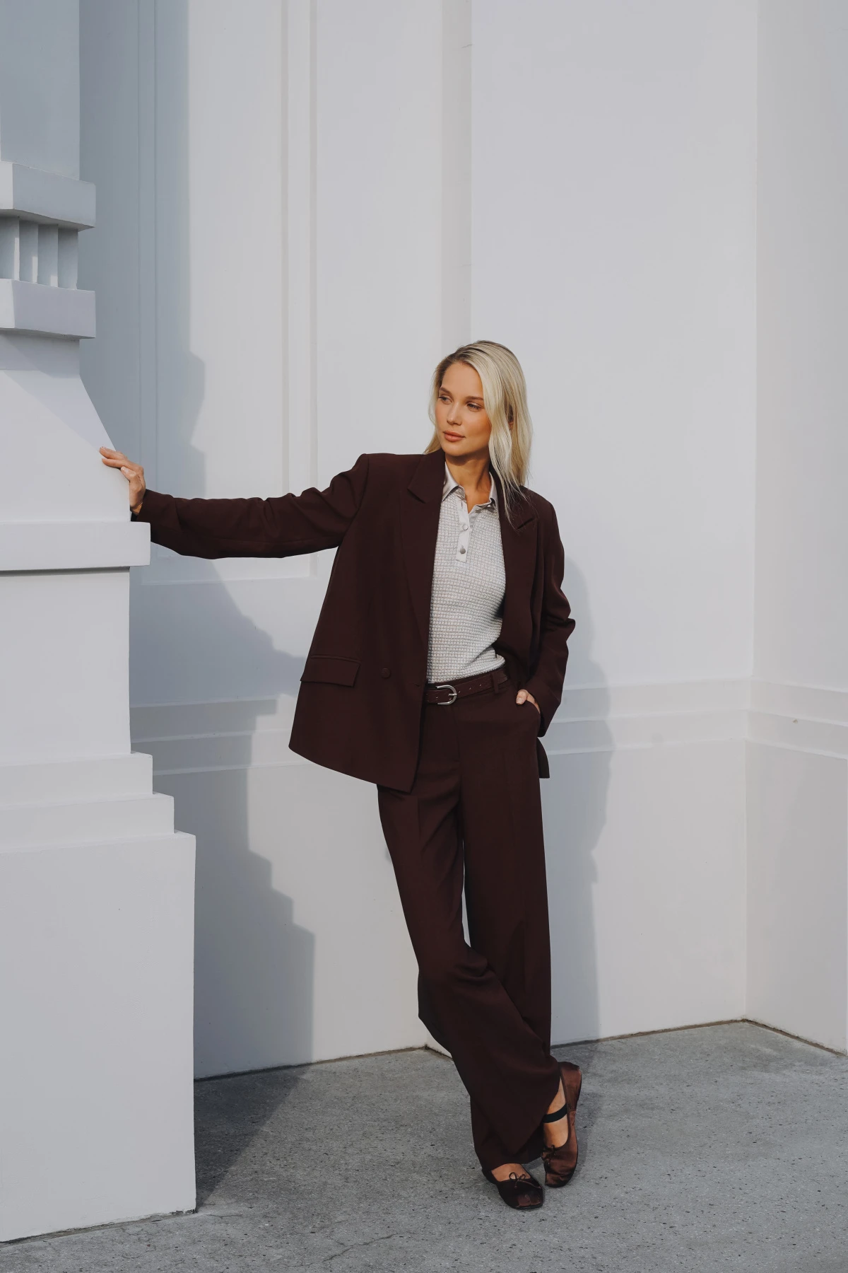 Удлинённый двубортный жакет в духе современной классики подчёркивает линию плеч и создаёт графичный силуэт. Глубокий шоколадный оттенок работает как универсальный цветовой акцент. Плотная костюмная ткань с добавлением района, тенсела и шерсти хорошо держит форму.