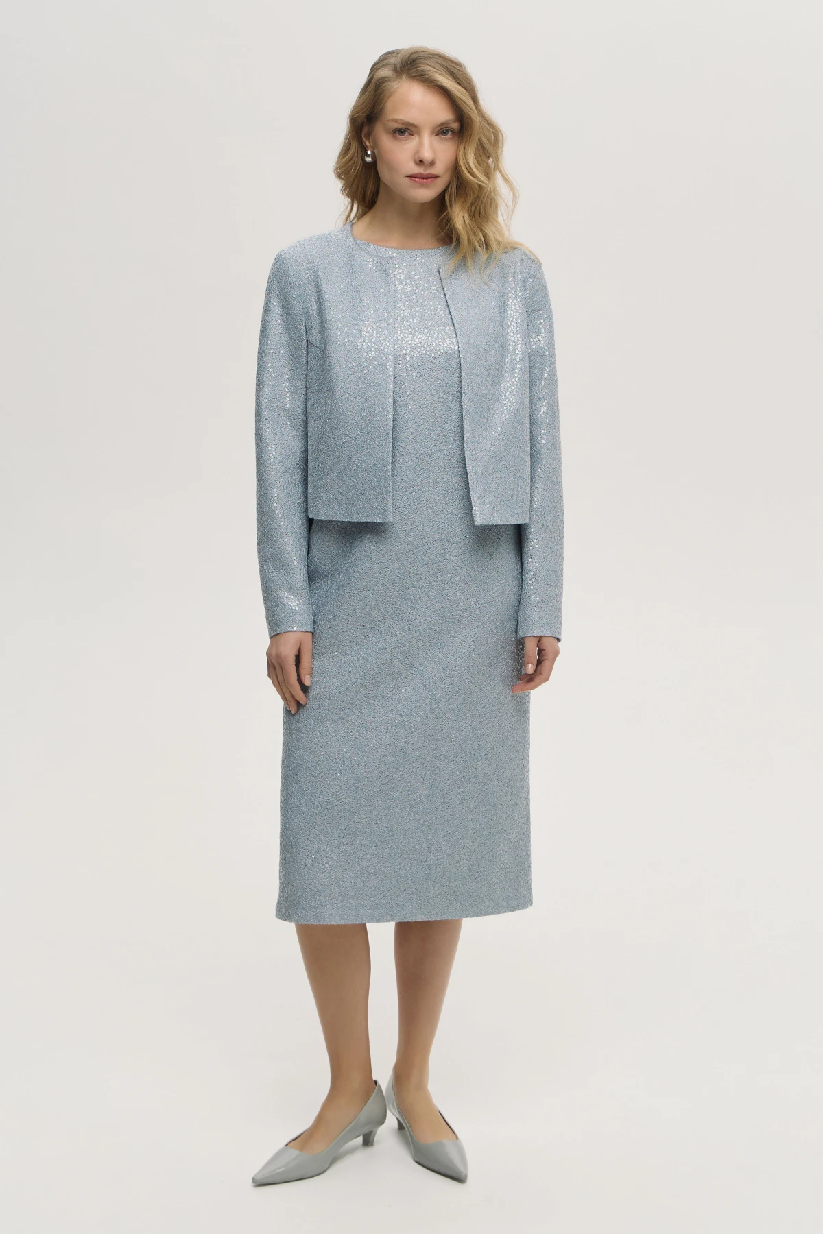 Прямой крой и трендовый укороченный силуэт подчёркивают фигуру. Фактурная ткань с пайетками придаёт жакету утончённый блеск. Стильный минимализм линий в сочетании с пайетками делает жакет универсальным, подходящим как для коктейльных мероприятий, так и для повседневных образов.