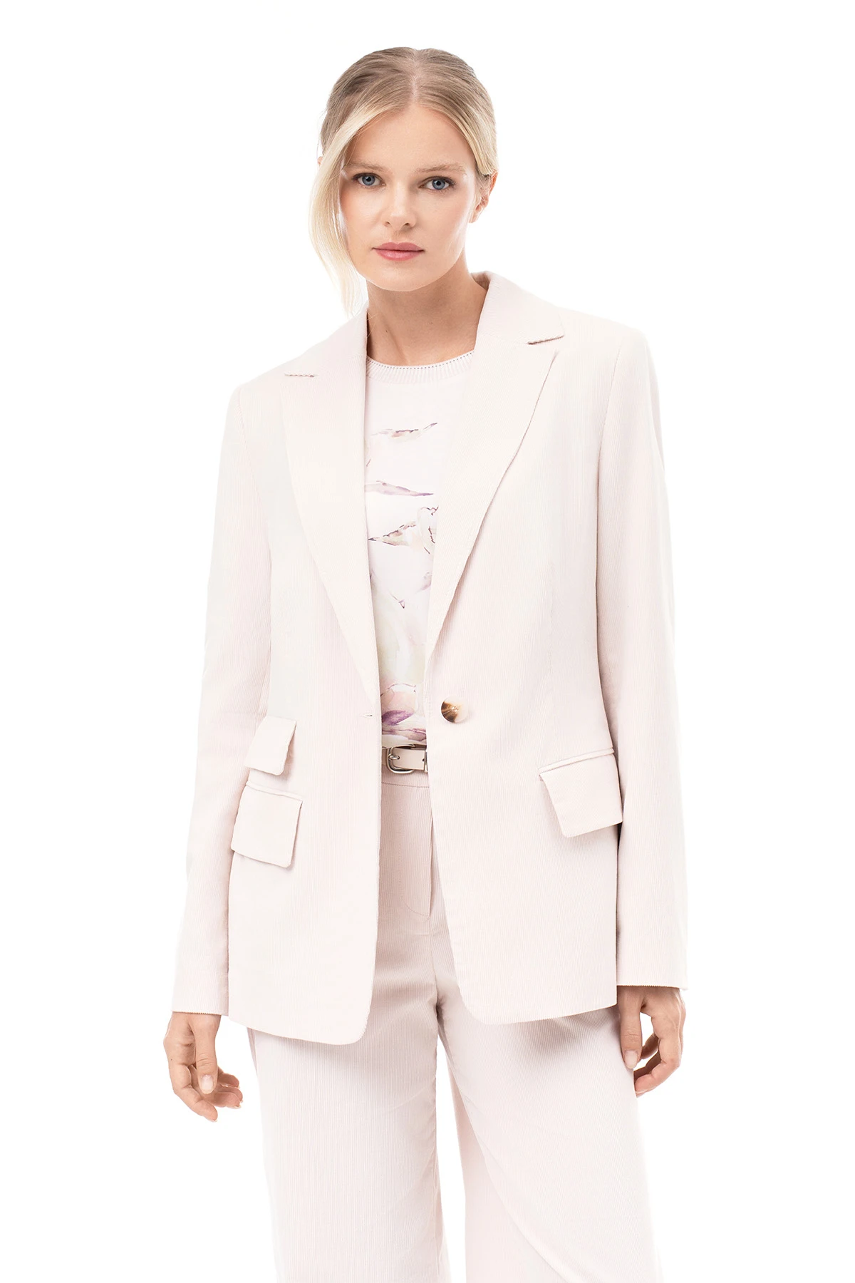 Элегантный однобортный жакет из натурального хлопкового вельвета в кремовом оттенке — стильное решение для современного гардероба.